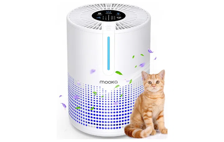 The Mooka air purifier is designed with advanced air spiral technology and a 360-degree air intake and outlet design to efficiently clean rooms up to 300 sq. ft.