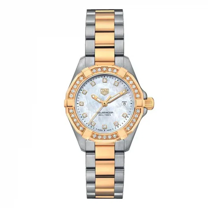 Tag Heuer Aquaracer 27mm gold-plated steel and steel quartz watch with diamonds, $6,050, Tag Heuer