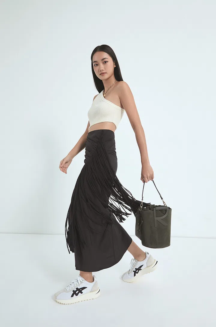Image: Cotton bodysuit, $1,850, and metal necklace, Celine. Cotton fringed skirt, Tory Burch. Moage Mo suede sneakers, Onitsuka Tiger. Bag, $3,910, Roger Vivier
