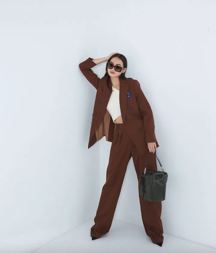 Image: Cotton bodysuit, $1,850, and metal necklace, Celine. Wool blazer, wool pants, and silk pocket square, Max Mara Tailleur Sartoriale. Bee 100 suede pumps, Jimmy Choo. RV suede bucket bag, $3,910, Roger Vivier. Acetate sunglasses, Burberry