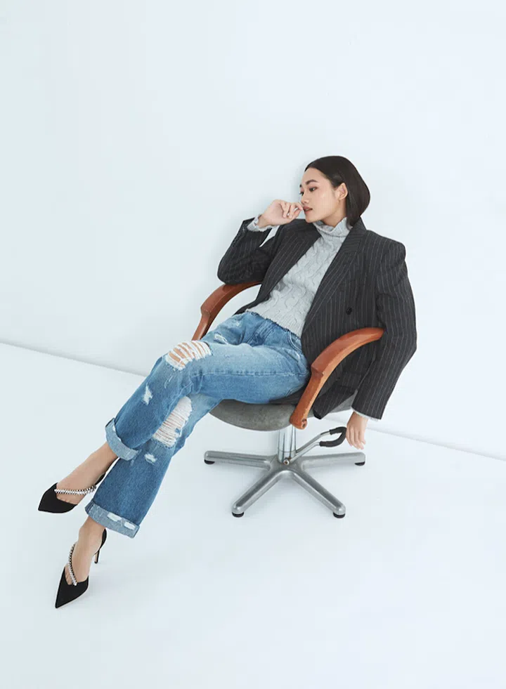 Image: Wool blazer, $4,450, Celine. Wool turtleneck and denim jeans, Michael Michael Kors. Bee 100 suede pumps, Jimmy Choo