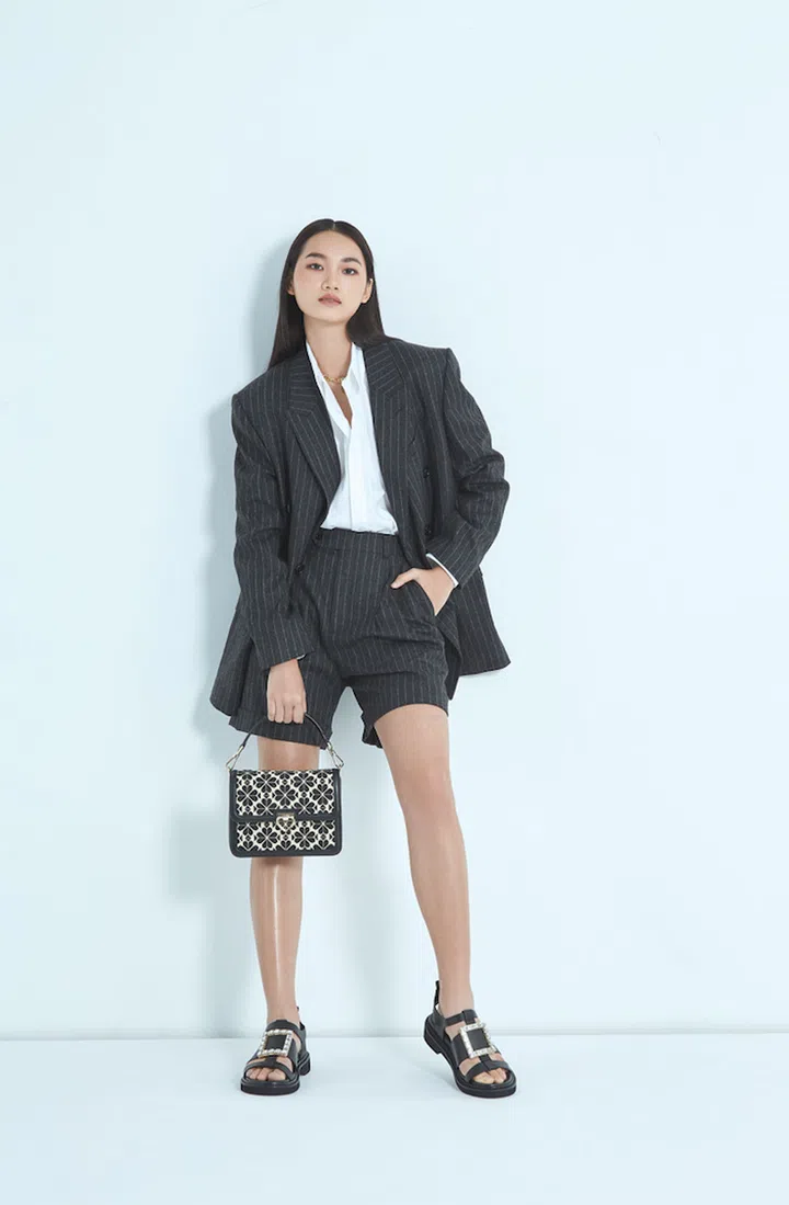 Image: Wool blazer, $4,450, cotton shirt, wool shorts, $1,450, and metal necklace, Celine. Spade Flower bag, Kate Spade New York. Viv’Ranger leather sandals, $2,500, Roger Vivier