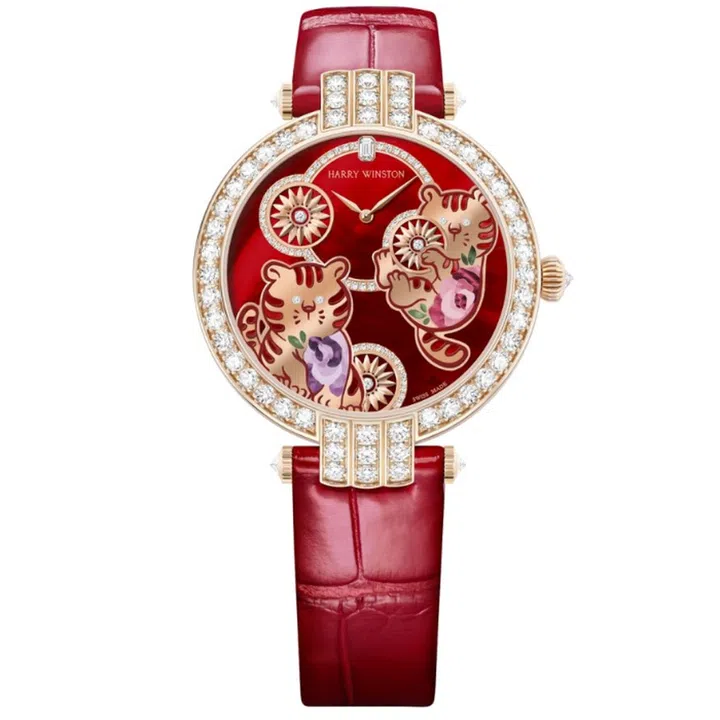 For its tiger-themed timepiece, Harry Winston has taken the soft-power route. Taking centre stage are two playful tiger cubs crafted from rose gold, with cut-outs filled with red mother-of-pearl representing their stripes. The dial also features three gold rosettes with a diamond at their centre — reflecting the patterns on the wrought iron gates leading to the brand’s flagship salon in New York City. It’s all housed in a 36mm rose gold case set with 57 brilliant-cut diamonds.