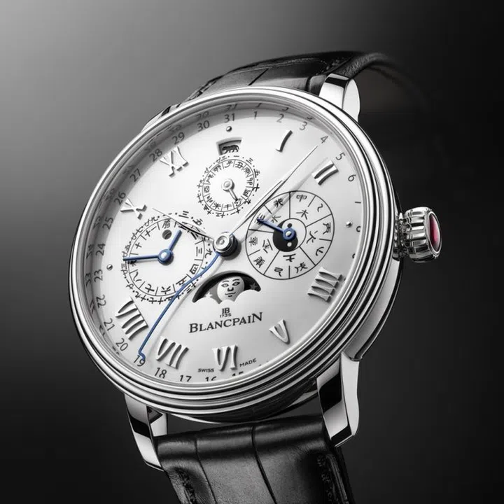 Housed in a 45mm platinum case, Blancpain’s self-winding Traditional Chinese Calendar features Chinese lunisolar calendar displays on a white grand feu enamel dial. The tiger is present in two no-so-obvious ways. Firstly, a discreet motif appears at 12 o’clock, and is one of the 12 animals of the Chinese zodiac represented on an adjustable disc. The second, larger tiger is engraved on the rotor and can be spotted through the sapphire caseback.