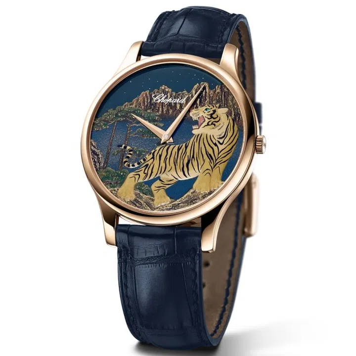 Chopard’s Chinese zodiac timepiece features an evocative tableau, with a majestic tiger standing above a bay surrounded by cliffs on a starlit night. The scene is crafted by master lacquer artist Minori Koizumi using the Japanese art of urushi maki-e, where gold flakes are placed between layers of lacquer made from the sap of the Chinese lacquer tree. The self-winding watch is presented in a 39.5mm, ultra-thin rose gold case.