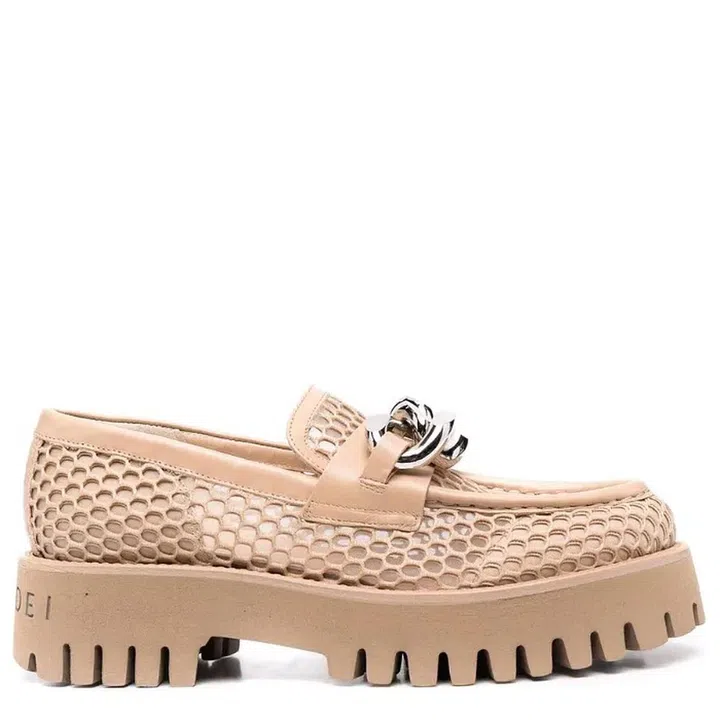 For those looking for a loafer that’s a little less conventional, look to this pair of mesh-covered, nude-coloured- chain-embellished loafers by Casadei.