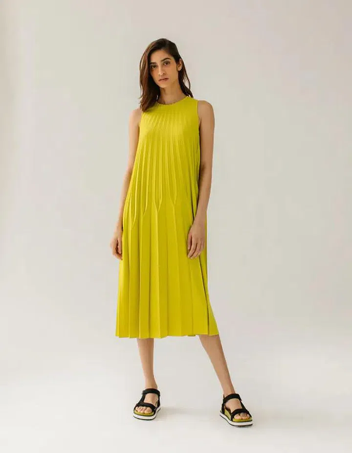 Known for her pleated confections, this searing green dress mixes different pleat widths to create an interesting flared shape. Perfect for days when you need a work outfit sorted in under a minute.