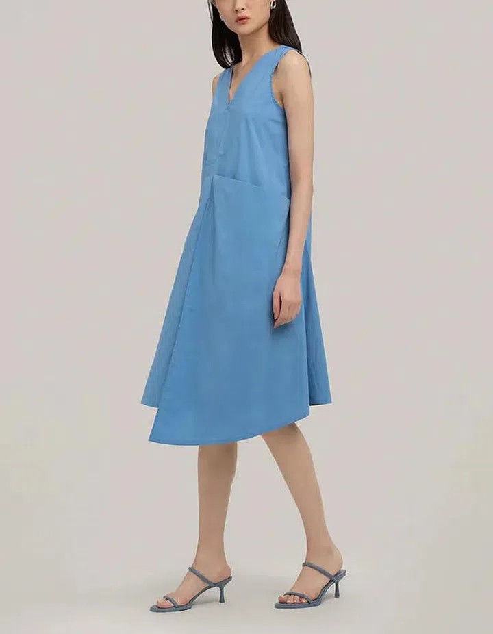 Meet the perfect shift dress for work. Cut in a feminine shade of cornflower blue, this dress comes with pleats worked into the back for extra volume and an exaggerated pocket that dips to the side. It’s architectural, minimalist and completely wearable.