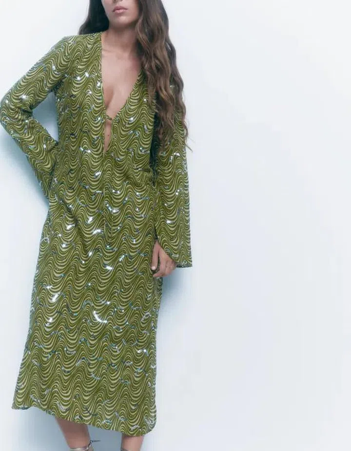 Look again at this printed green dress, and you’ll realise that the optical pattern is highlighted by wavy slivers of sequins that pick up the light as you dance the night away.