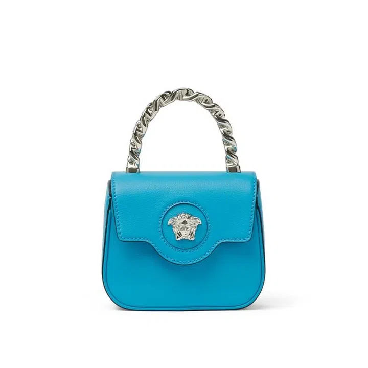 A classic silhouette like the top handle bag gets an injection of youthful energy in cyan.