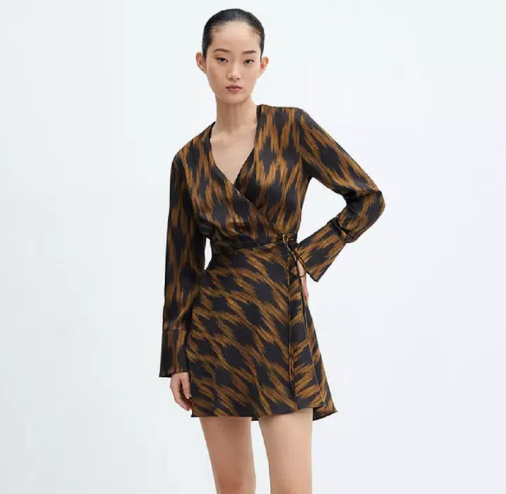 Take a walk on the wild side with this printed wrap dress that'll look great with boots or heels.