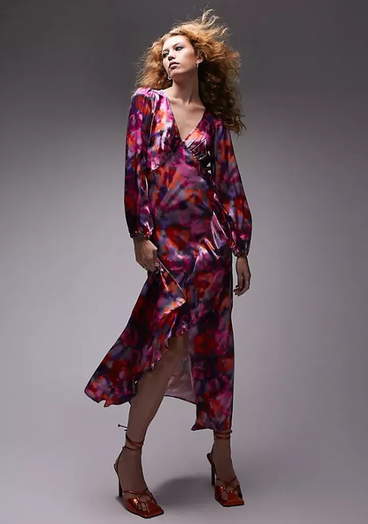 Embracing prints? Try this abstract rose print in vibrant jewel tones and a glossy silky fabric.