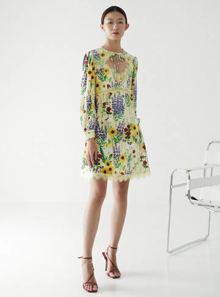 Stand out in a sea of blacks, solid hues or jewel tones with this cheery frock embroidered with a multitude of vibrant blooms.