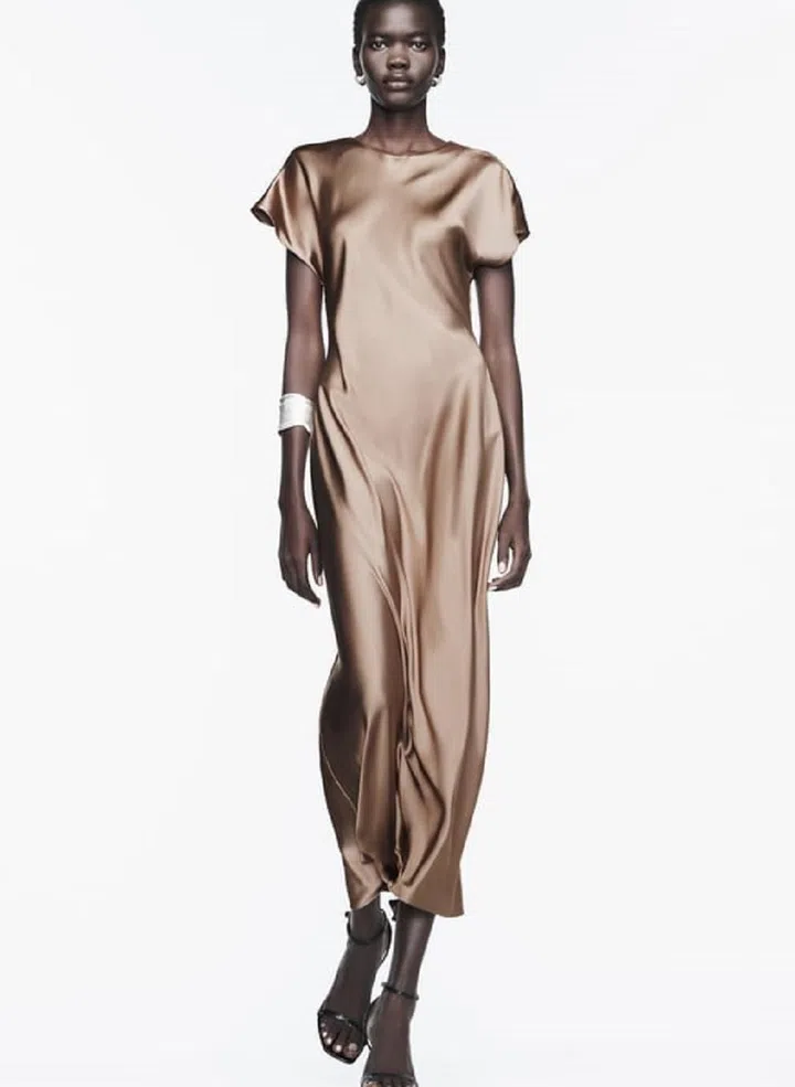 When you're in a rush, throw on this elegant sheath for instant glamour. The fluid silhouette that gently hugs the waist and gleaming fabric offers understated glamour. And on your way out, throw on dangly earrings, a long necklace or a gold bangle for extra oomph.
