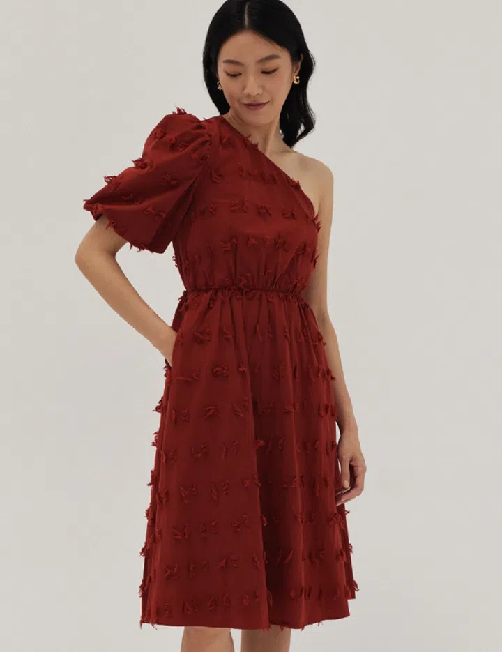 This toga midi dress has a flattering flared silhouette with an off-shoulder neckline and a puff sleeved for a statement look. Textured cotton adds interest, and there are functional side pockets, too.
