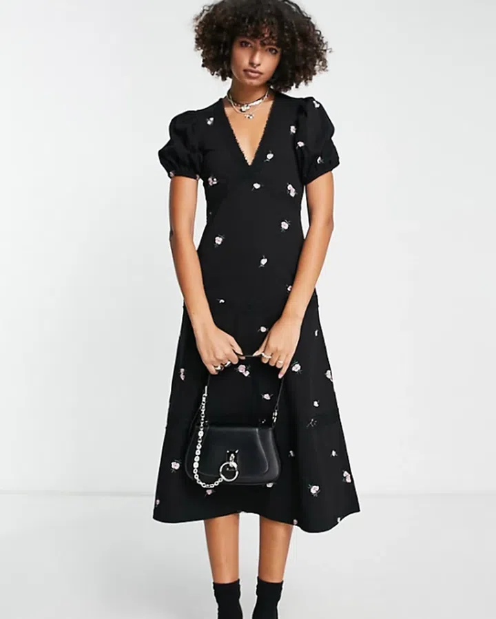Asos Design tiered midi dress with lace trim and pink rose embroidery in black, $109.99, Asos