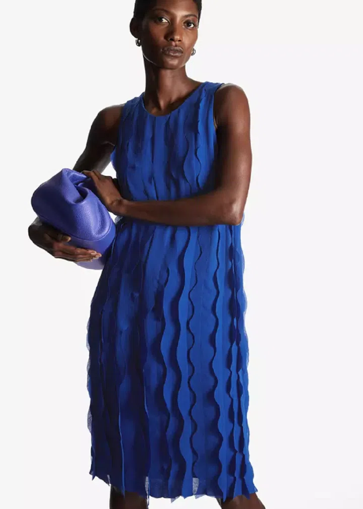 A bold cobalt colour and cute ruffles elevate an otherwise simple shift dress, which is perfect for both work and play. It's also available in black for a more pared-down look.