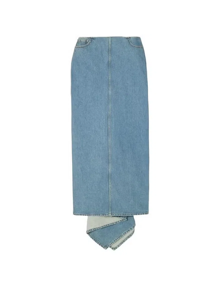 A denim maxi skirt with a mermaid silhouette as seen at brands like Burberry and instantly gives the garment a dressed-up look. Credit: Burberry