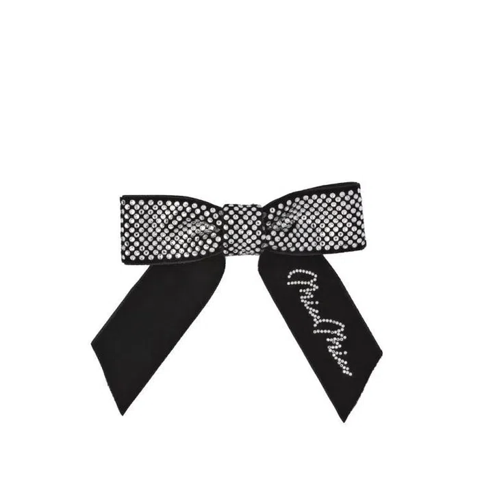 The classic black hair bow is reworked by Miu Miu in black velvet and artificial crystals that spell out the brand’s name.