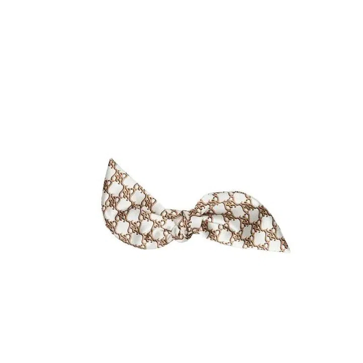 Asymmetrically designed with two upturned ends, Fendi’s bow-shaped clip is made from satin and adorned with the brand’s FF Karligraphy motif in beige lettering.