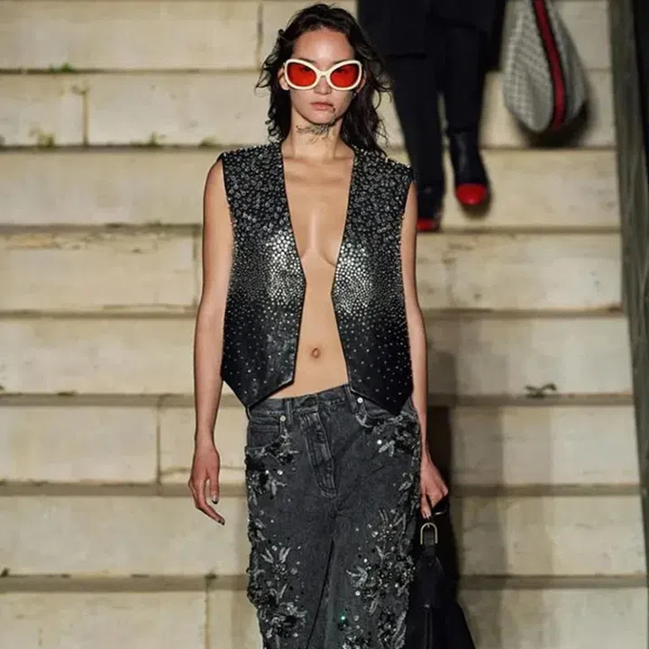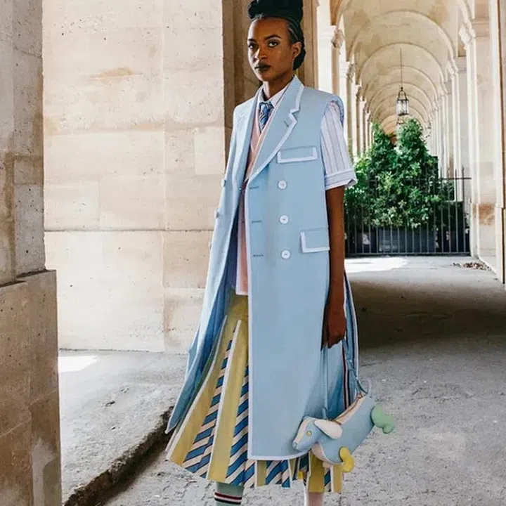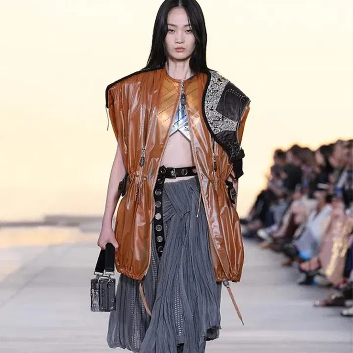 Always fashion-forward, Gucci ditched the shirt and paired their bedazzled number with equally blinged-out denims—a fit the cool street set will surely approve of. Louis Vuitton’s oversize parachute-like vest with zipper hardware, layered over a metallic top and billowy skirt, gave us epic Dune vibes. Thom Browne kept to the garment’s tailored roots with a refreshing dash of sorbet pastels which lent the elongated silhouette an instant softness and calming aura.