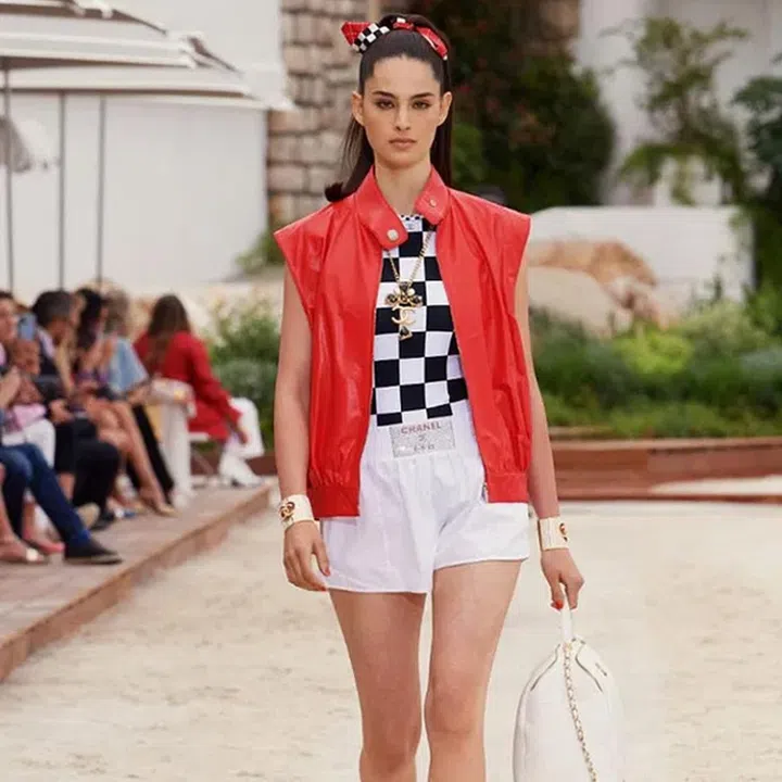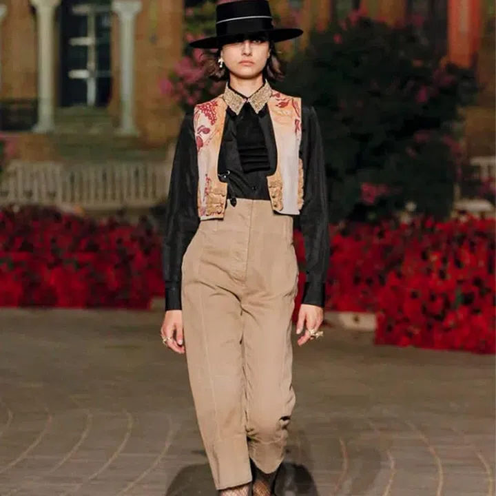 With a Grand Prix- themed collection, Chanel’s breezy checkerboard look was anchored by a relaxed leather biker vest in red—a seductive counterpoint to the sporty ensemble. Dior took inspiration from the traditional Andalusian campero suit, with an intricately embroidered and embellished waistcoat worn over high-waisted trousers and wing-tipped shoes, which evoked a sense of refined adventure.