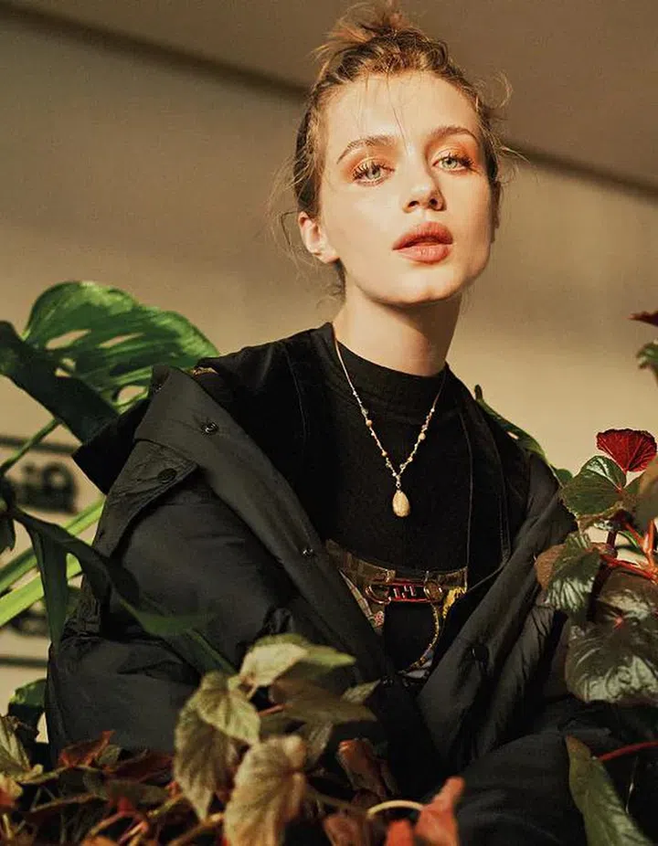 High-neck long-sleeved bodysuit, Balenciaga. Velvet vest, Gucci. Printed sleeveless bodysuit with gold safety-pin detail, Fendi. Oversized puffer jacket, Onitsuka Tiger. Beaded necklace, The Affirmation Club.