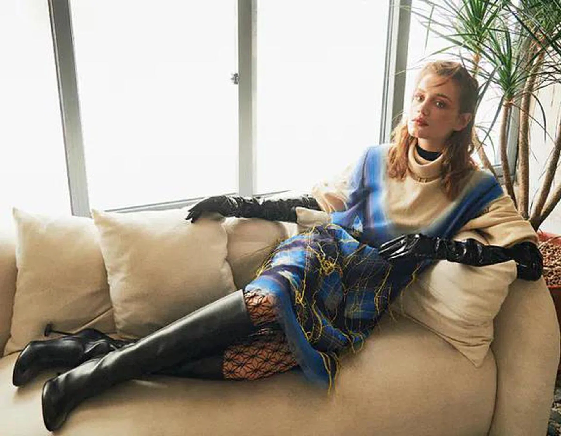 Embellished dress and wool sweater, Louis Vuitton. Patent leather gloves and knee-high netted stockings, Gucci. Leather knee-high boots, Balenciaga. Knit turtleneck (worn underneath), stylist’s own.
