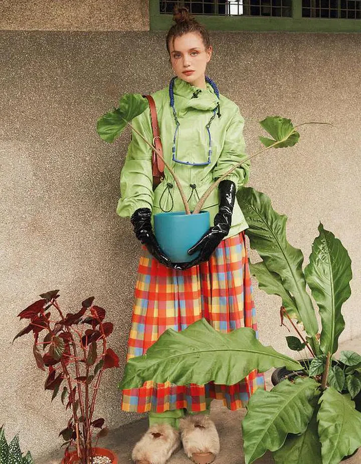 Leather oversized windbreaker and matching trousers, Bottega Veneta. Cotton chequered maxi skirt, Tory Burch. Patent leather gloves, Gucci. Sunglasses with detachable cord, D&G. Calfskin shoulder bag, Coach. Leather and fur-trimmed platform slip-ons, Celine.