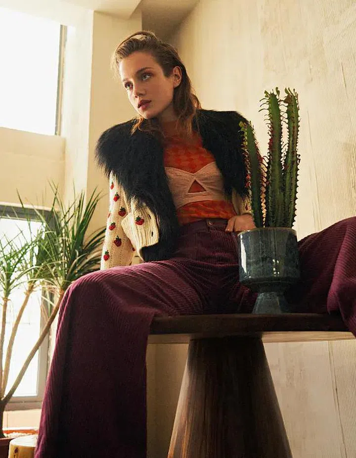 Knit short-sleeved top, Tory Burch. Wool embroidered and fur-trimmed cardigan and bra top, Gucci. Corduroy high-waist trousers, Coach.