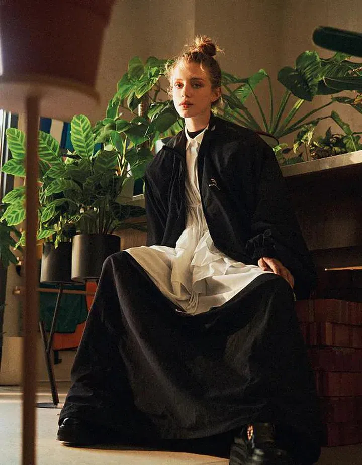 Oversized jacket and padded maxi skirt, Balenciaga. Cotton oversized ruffled shirt dress, Onitsuka Tiger. Leather platform creepers, Celine. Knit turtleneck (worn underneath), stylist’s own.
