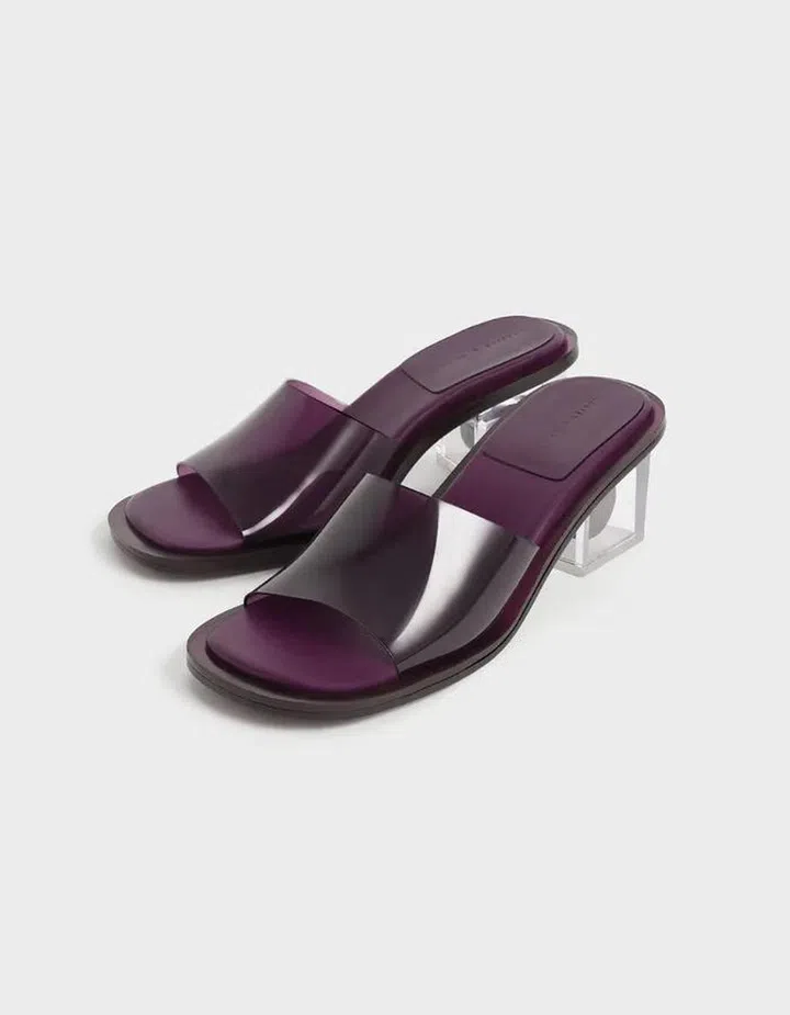 Madison Clear Sculptural Heel Mules in Purple, $79.90, Charles & Keith