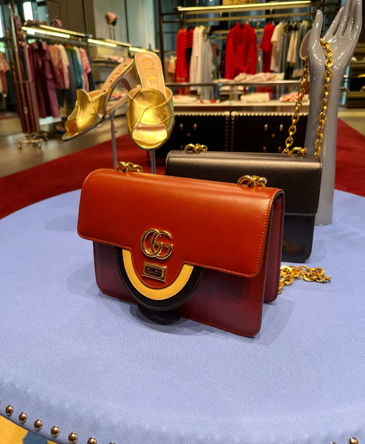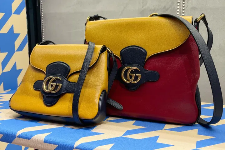 You will first notice that there are two bags in this picture. Whilst the smaller one is full mustard, the bigger one uses both yellow and red that complement each other. Both feature the gold Gucci logo detail on the clasp and shoulder straps to sling over your body.