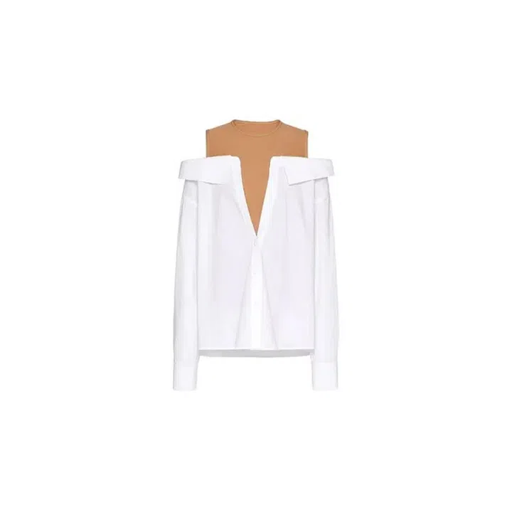 The inner bodysuit helps to create the illusion that the white outer shirt is slipping off your shoulders when worn. The shirt also comes in a ebony and light camel colour.