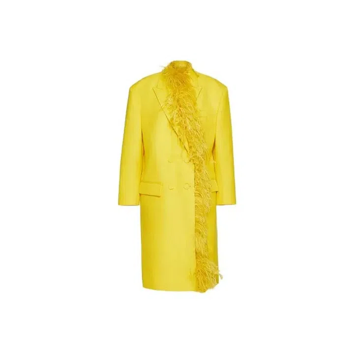 This sunshine yellow long coat is lined at the opening with removable feathers and lined with pure silk.
