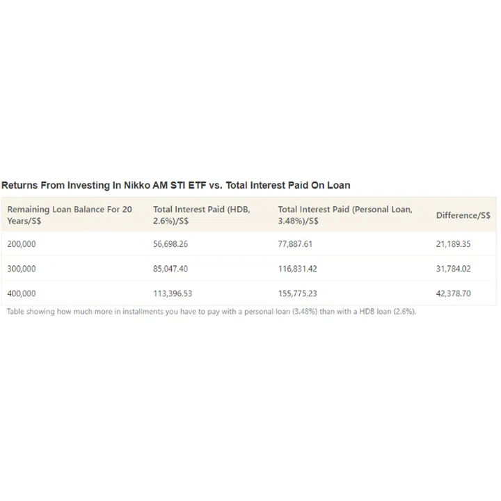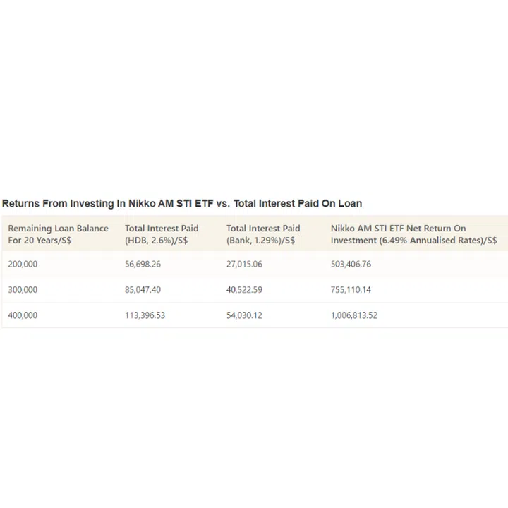 - Assuming an initial home loan of $200,000, investing the amount into an STI ETF like the Nikko AM can produce returns nearly 10 times as much as the total interest paid on a HDB loan.