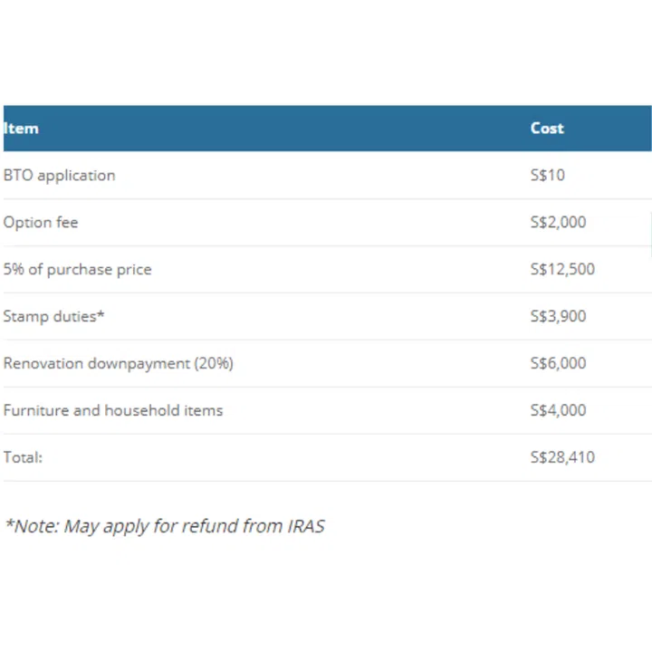 Financial costs: S$500 to S$2,000, depending on flat type