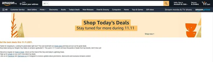 Amazon Singapore has announced its first-ever 11.11 sales this year. From Nov 11 to 29, 2021, you'll get to enjoy discounts across categories like children's toys and books, homeware, beauty, health and even groceries on Amazon Fresh. Think brands like Apple, Muji, Click and Grow, and KeaBabies. Don't forget to check collect vouchers for further discounts.