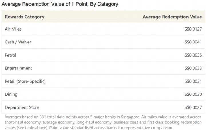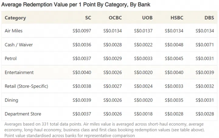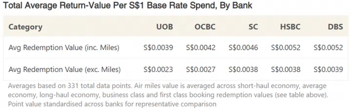 On a final note, the potential return-value of S$1 spend can actually vary from bank to bank. To clarify, it's easy to calculate the redemption-value of 1 point within a given bank. This is helpful if you're looking to redeem points from a credit card that you already own. However, this analysis cannot be compared cross-bank because it may be easier to earn 1 point with a credit card from one bank than with another. For example, you might earn 1 point per S$1 general spend with an HSBC credit card, but earn 1 point per S$5 spend with a DBS credit card. When calculating redemption values on its website, it may seem like the value of 1 point earned from DBS is remarkably high–but that's because it's harder to earn. To facilitate an even analysis, we've standardised point earnings across the 5 banks reviewed, defaulting to the base rate for every S$1 spend. The table below shows the ultimate return value-to-consumer per S$1 general spend across multiple categories and banks.