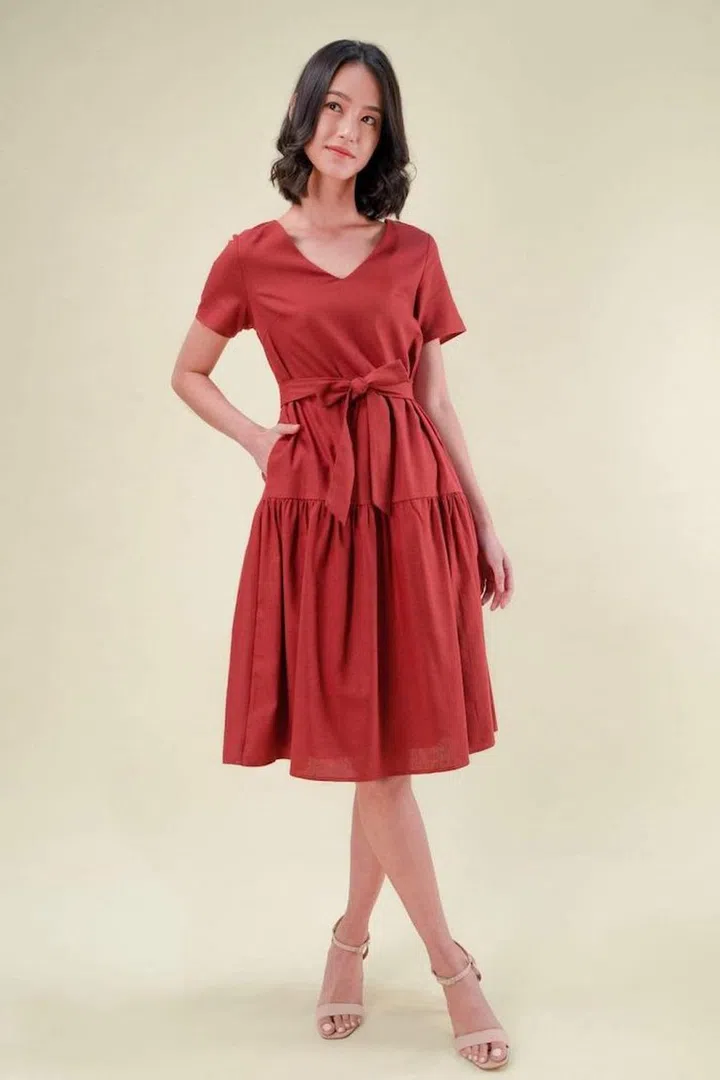 This brick red number comes with a removable sash that you can use to cinch the waist, or do without for a more relaxed look. Consequently, this dress is great for both work and off-days with a pair of kitten heels and stud earrings.