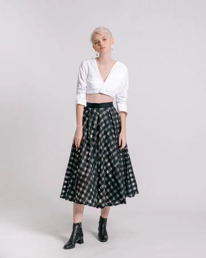 This checked number is made for casual Fridays and weekends. Go with a simple cropped top to let the skirt shine, and choose between boots for a grungy look and dad sneakers for a streetwear-inspired style.