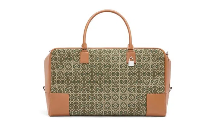 Loewe’s Amazona bag was launched in the 1970s as a top handle bag before it got updated in larger, more travel-friendly proportions. The detachable and adjustable strap further increases its versatility as a shoulder or crossbody bag. The weekend bag is made with Anagram jacquard and calfskin trims, with protective metal feet on the base.