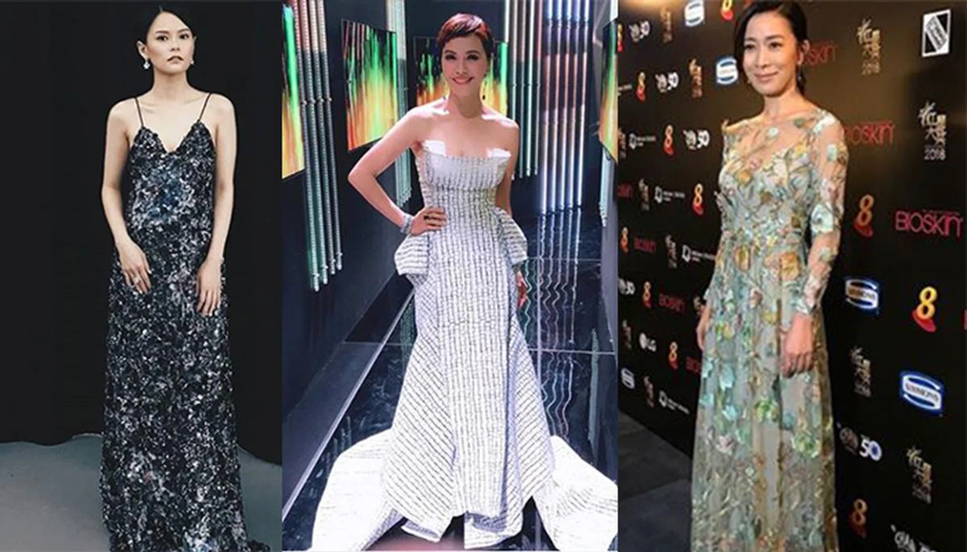 Veteran actress and “Queen of Caldecott Hill” Zoe Tay stood out from the crowd with a dramatic structured gown, while young favourites such as Jayley Woo opted for sexy, skin-baring column gowns.