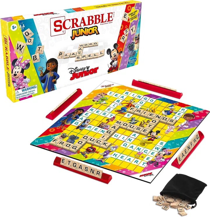 Journey with Mickey, Minnie, Goofy, and more as you lay out words on the board. Whether it's a rainy day indoors or a family game night, Hasbro's Scrabble: Disney Junior Edition is the perfect blend of education and entertainment.