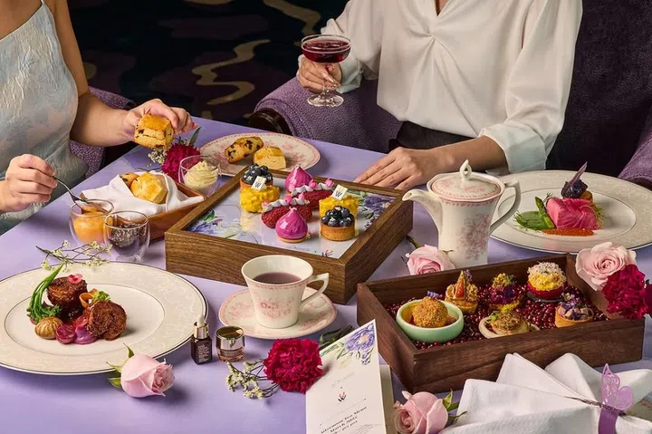 Doused in hues of purple, there'll be treats like smoked chicken and saffron aioli in a parmesan ube bun, whipped foie gras choux puff, and a smoked duck tart with charred purple cauliflower. Get your sweet fixings with the likes of a Tea Blossom Eclair that has lavender Chantilly cream and a Sunlit Swirl of cassis mousse with fruits and almond sponge.