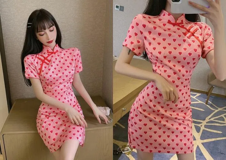 To show some love for the new year, this cheongsam would make a good option. It's covered in red heart-shaped prints and we love how it complements the pink fabric. It's both festive yet quirky at the same time!