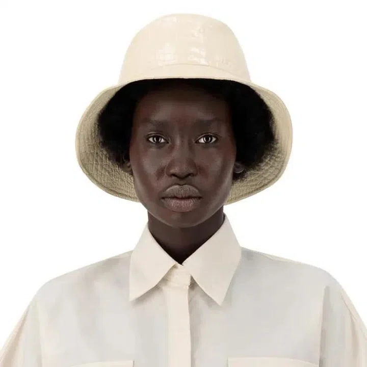 Leather hats for this hot and humid climate? The real deal isn’t the most weather-friendly, but this vegan leather embossed croc iteration is appropriate for our hot and humid climate rain or shine. Wear it with a button down shacket, bralet top and high-waisted trousers with slides.