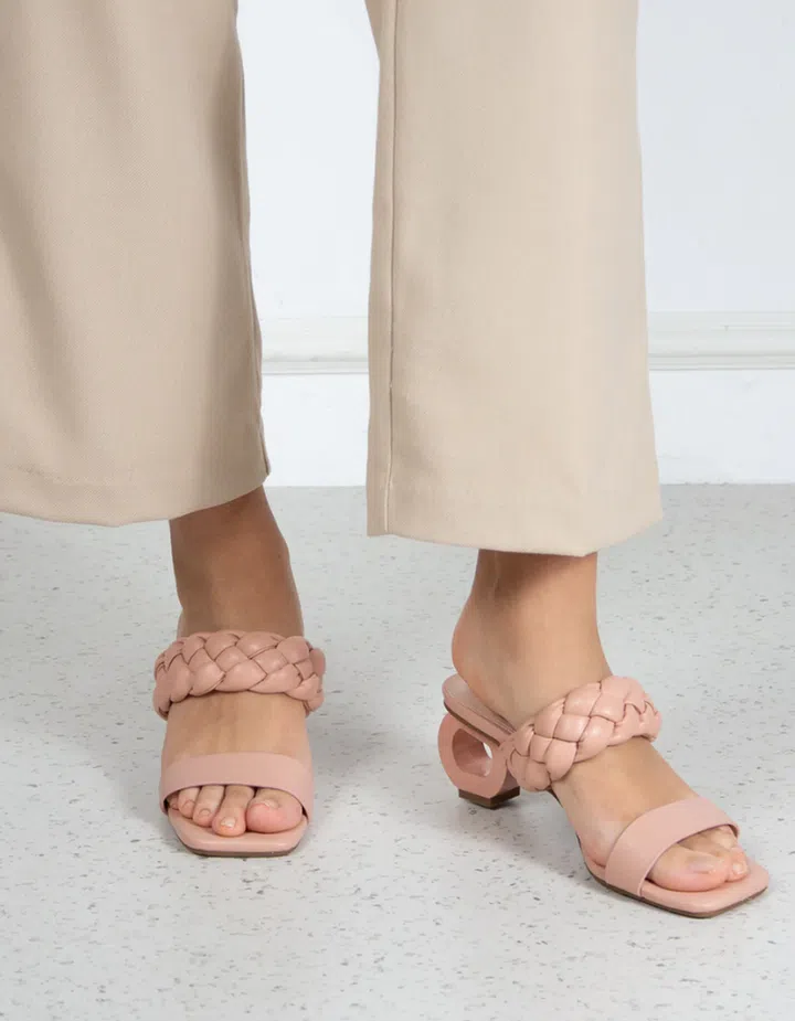 This blush pink sandals are a must-have for everyone. With a heel that’s just under three inches, the braided detailing and architectural heel design gives an interesting twist to the classic nude sandals.