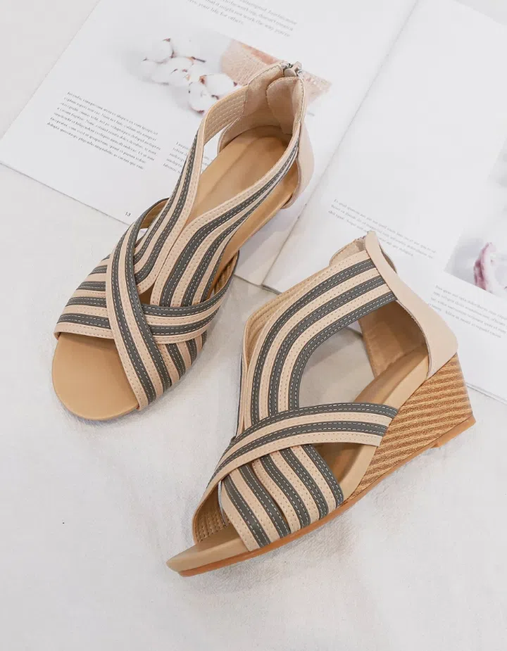 A low wedge is a great bet for those who find themselves on their feet a lot, as it offers the elevation of a heel without the discomfort. With overlapping stripes that criss-cross around the foot, this zip-up wedge sandal can be worn with skinny black pants for an everyday work look.