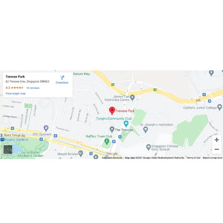 Despite some online sources citing long walking distances, Trevose Park is within a 10-minute walk of Stevens MRT station (online maps often place the MRT on the opposite side of the flyover, with a roundabout route). The distance is about 420 metres.